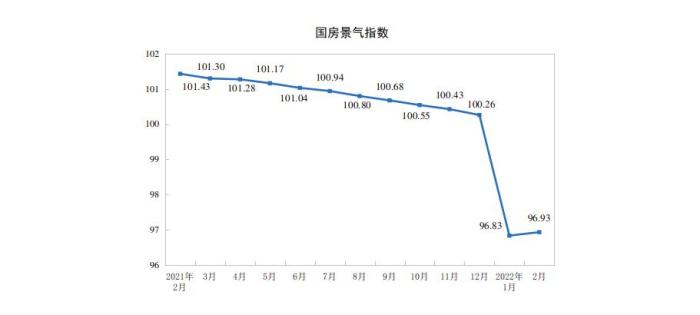 2月份,房地產(chǎn)開(kāi)發(fā)景氣指數(shù)(簡(jiǎn)稱(chēng)“國(guó)房景氣指數(shù)”)為96.93。