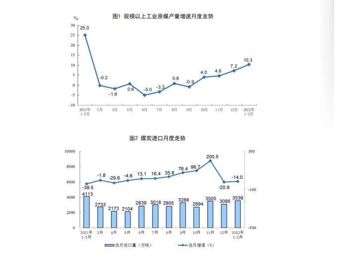 原煤生產(chǎn)較快增長,進口降幅收窄。1—2月份,生產(chǎn)原煤6.9億噸,同比增長10.3%,增速比上年12月份加快3.1個百分點,日均產(chǎn)量1164萬噸。進口煤炭3539萬噸,同比下降14.0%,降幅比上年12月份收窄6.9個百分點。
