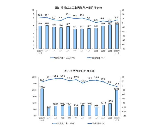 天然氣生產(chǎn)保持增長,進口下降。1—2月份,生產(chǎn)天然氣372億立方米,同比增長6.7%,增速比上年12月份加快4.4個百分點,日均產(chǎn)量6.3億立方米。進口天然氣1986萬噸,同比下降3.8%,上年12月份為增長4.6%。