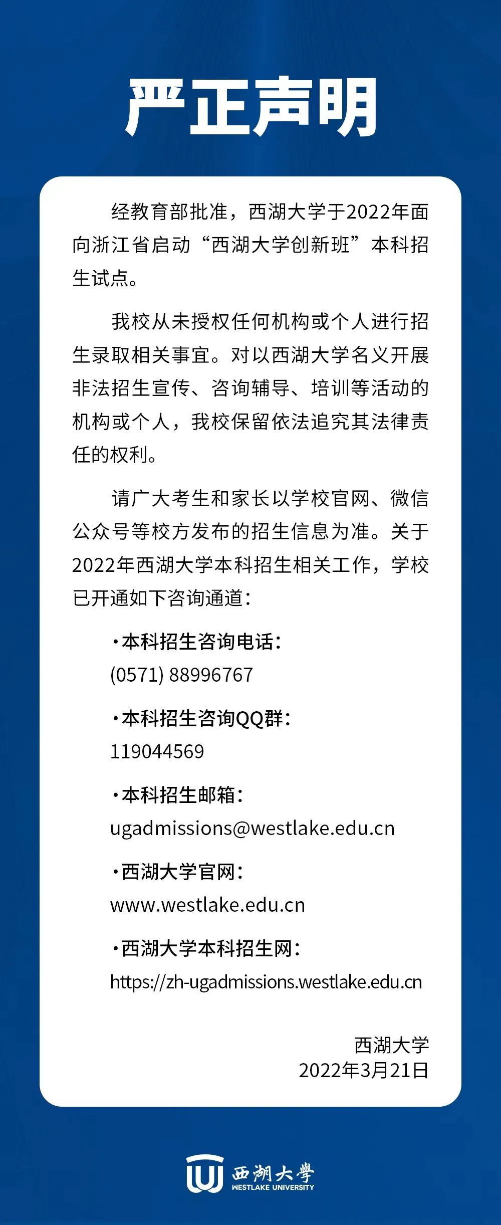 中新網(wǎng)3月21日電 據(jù)“西湖大學(xué)WestlakeUniversity”微信公眾號(hào)消息,3月21日,西湖大學(xué)發(fā)布《關(guān)于2022年西湖大學(xué)本科招生的嚴(yán)正聲明》,聲明指出,經(jīng)教育部批準(zhǔn),西湖大學(xué)于2022年面向浙江省啟動(dòng)“西湖大學(xué)創(chuàng)新班”本科招生試點(diǎn)。該校從未授權(quán)任何機(jī)構(gòu)或個(gè)人進(jìn)行招生錄取相關(guān)事宜。對(duì)以西湖大學(xué)名義開展非法招生宣傳、咨詢輔導(dǎo)、培訓(xùn)等活動(dòng)的機(jī)構(gòu)或個(gè)人,該校保留依法追究其法律責(zé)任的權(quán)利。