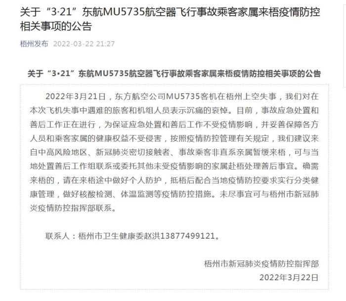 中新網(wǎng)3月22日電 據(jù)“梧州發(fā)布”微信公眾號消息,3月22日,梧州市新冠肺炎疫情防控指揮部發(fā)布通告稱,2022年3月21日,東方航空公司MU5735客機在梧州上空失事。目前,事故應急處置和善后工作正在進行,為保證應急處置和善后工作不受疫情影響,并妥善保障各方人員和乘客家屬的健康權益不受侵害,按照疫情防控管理有關規(guī)定,我們建議來自中高風險地區(qū)、新冠肺炎密切接觸者、事故乘客非直系親屬暫緩來梧,可與當?shù)靥幹蒙坪蠊ぷ鹘M聯(lián)系或委托其他未受疫情影響的家屬赴梧處理善后事宜。