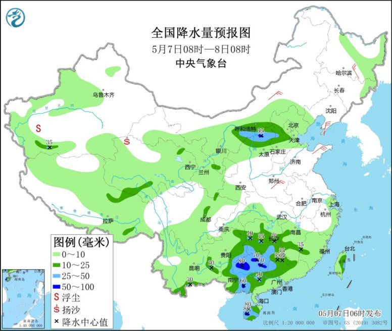 5月7日08時至8日08時,內(nèi)蒙古河套地區(qū)、陜西北部、山西北部、河北西部、重慶東南部、貴州東部和南部、云南東部和南部、湖南中南部、江西南部、廣西、廣東北部和西部、海南島等地的部分地區(qū)有中到大雨,其中,山西北部、廣西北部和東南部、海南島中西部等地局地暴雨(50~90毫米)。內(nèi)蒙古、西北地區(qū)東部、東北地區(qū)北部和南部、華北北部和西部、黃淮大部、江南東部、西藏中北部等地的部分地區(qū)有4~6級風(fēng)(見圖1);渤海、渤海海峽有6~7級、陣風(fēng)8級的偏北風(fēng)。