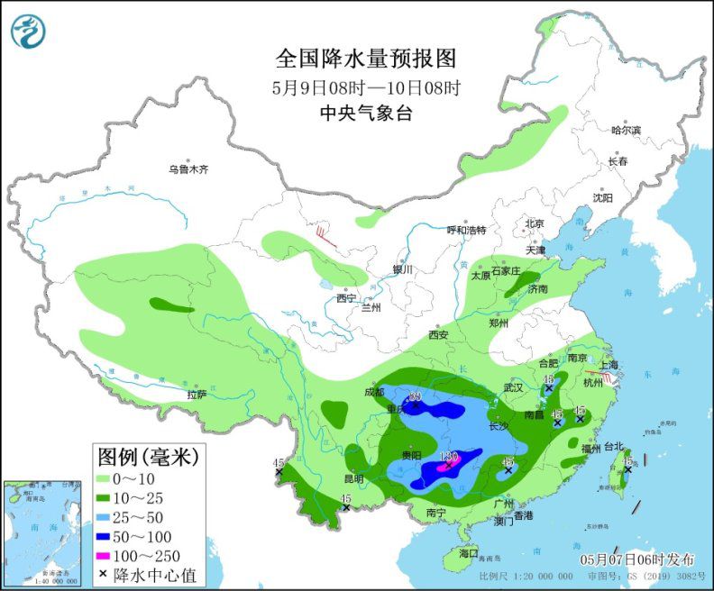 5月8日08時至9日08時,甘肅南部、陜西北部和西南部、山西中部、河北南部、四川盆地西部、貴州西部和南部、云南東部和南部、湖北東南部、江西、湖南東部和南部、廣西、廣東北部、福建南部等地的部分地區(qū)有中到大雨,其中,四川盆地西部和南部、廣西北部和南部等地局地暴雨(50~90毫米)。新疆北部、江南東部、西藏中北部等地的部分地區(qū)有4~6級風(fēng)(見圖2)。