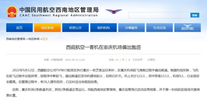 中新網(wǎng)5月12日電 據(jù)民航局網(wǎng)站消息,民航局今日就西藏航空一客機在重慶機場偏出跑道發(fā)布通報。通報稱,2022年5月12日,西藏航空公司TV9833航班在執(zhí)行重慶—林芝客運任務(wù)時,在重慶機場起飛滑跑過程中偏出跑道。根據(jù)機組反映,飛機在起飛過程中出現(xiàn)異常,按程序中斷起飛,偏出跑道后發(fā)動機擦地起火,目前已撲滅。機上共計122人,其中旅客113人,機組9人,已全部安全撤離。在撤離過程中,有36人擦傷扭傷,已及時送當(dāng)?shù)蒯t(yī)院檢查。
