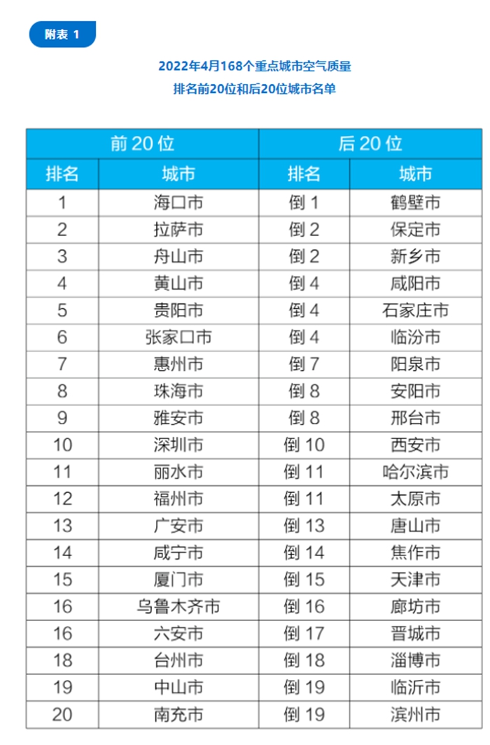 在重點(diǎn)城市排名中,4月,168個(gè)重點(diǎn)城市中,海口、拉薩和舟山市等20個(gè)城市空氣質(zhì)量相對(duì)較好;鶴壁、保定和新鄉(xiāng)市等20個(gè)城市空氣質(zhì)量相對(duì)較差。