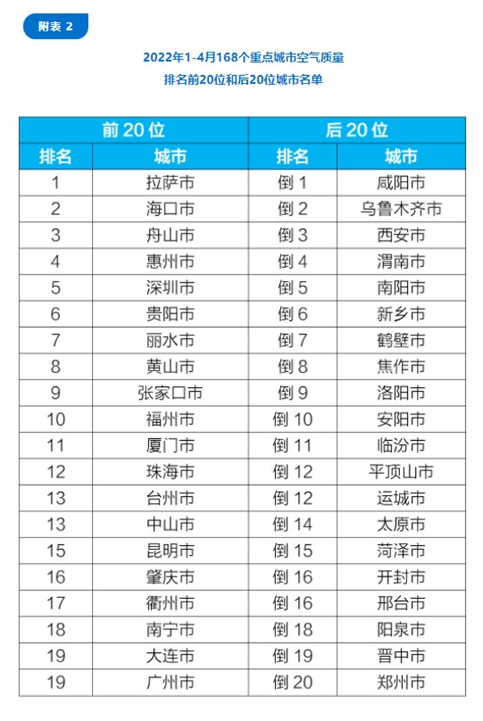 1—4月,168個(gè)重點(diǎn)城市中,拉薩、海口和舟山市等20個(gè)城市空氣質(zhì)量相對(duì)較好;咸陽(yáng)、烏魯木齊和西安市等20個(gè)城市空氣質(zhì)量相對(duì)較差。(完)