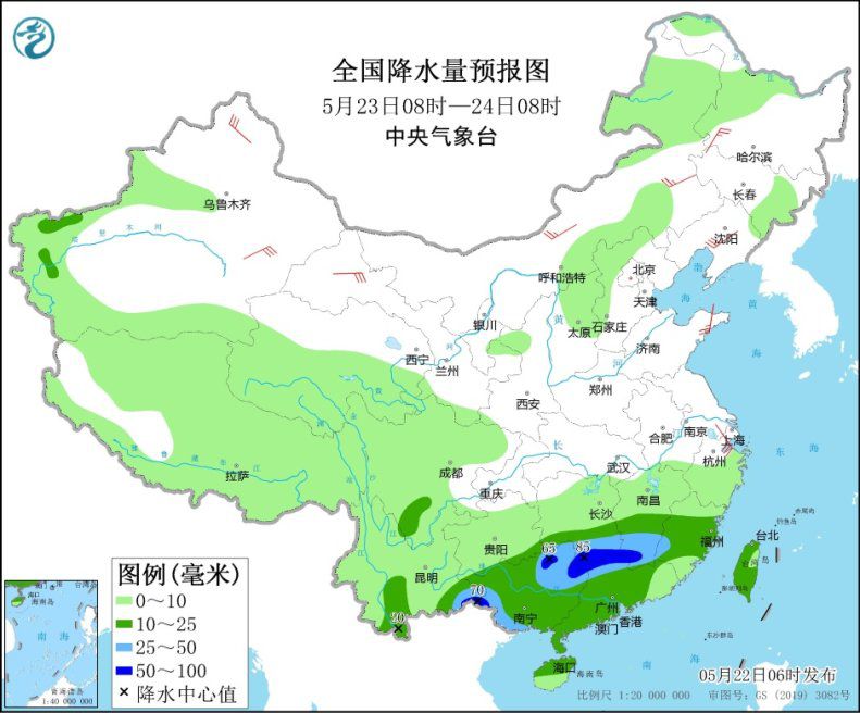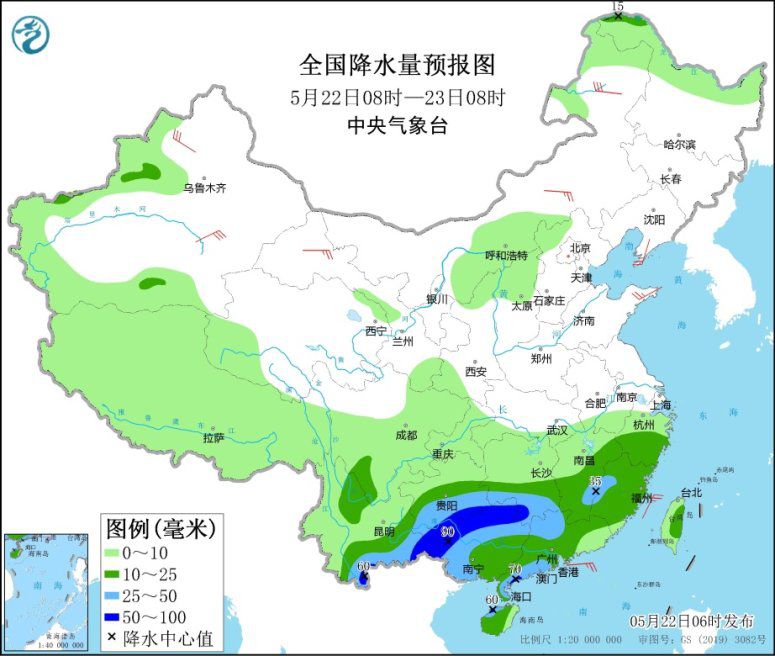 5月22日08時至23日08時,西藏、青海西南部等地有小雨或陣雨,高海拔地區(qū)有小到中雪或雨夾雪;江南東部和南部、華南大部、貴州中南部、云南南部、黑龍江西北部等地部分地區(qū)有中到大雨,其中,云南南部、貴州南部、廣西北部、湖南南部、廣東西南部沿海等地部分地區(qū)有暴雨(50~90毫米)。新疆北部和南疆東部、甘肅北部、內(nèi)蒙古西部和東部等地部分地區(qū)有4~6級風(fēng)。