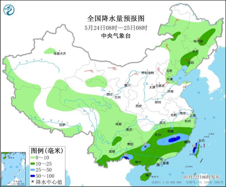 5月24日08時至25日08時,西藏北部和西部、青海南部、川西高原等地有小雨或陣雨,高海拔地區(qū)有小到中雪或雨夾雪;江南中南部、華南大部、云南南部、黑龍江東部、遼寧中部、臺灣島等地部分地區(qū)有中到大雨,其中,江西南部、福建西部、云南東南部、廣西西南部、臺灣島西部等地部分地區(qū)有暴雨(50~75毫米)。東北地區(qū)中南部、華北北部和東部、黃淮北部和東部、內(nèi)蒙古、甘肅北部等地部分地區(qū)有4~6級風(fēng),內(nèi)蒙古西部部分地區(qū)有6~7級風(fēng)。