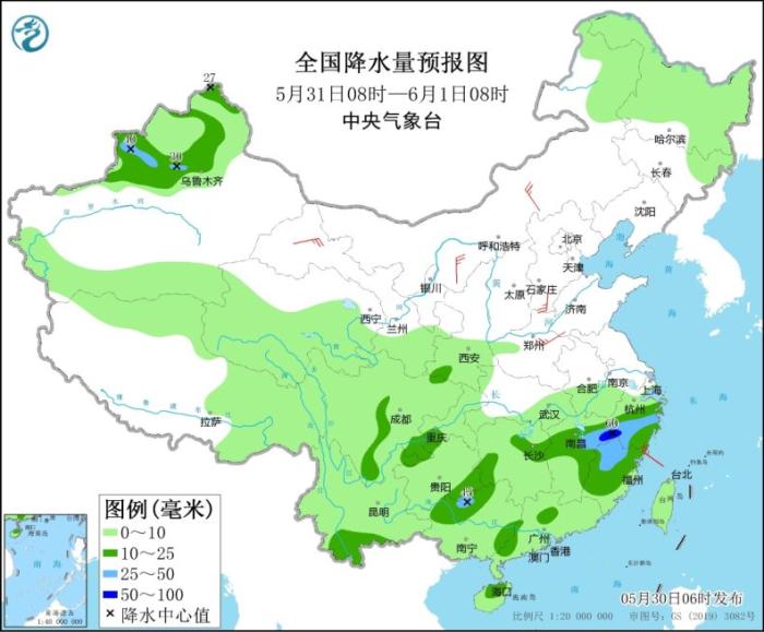 5月31日08時(shí)至6月1日08時(shí),新疆沿天山地區(qū)和伊犁河谷、湘贛北部、浙江中南部、福建、貴州南部、廣西北部、云南南部、四川盆地東南部等地的部分地區(qū)有中到大雨,其中,江西東北部、浙江西部等地局地暴雨(50~60毫米)。內(nèi)蒙古中西部、甘肅河西、河北南部、河南東部等地的部分地區(qū)有4~5級(jí)風(fēng)。黃海中部海域、臺(tái)灣以東洋面有5~6級(jí)、陣風(fēng)7級(jí)的偏南到西南風(fēng),東海南部海域有4~6級(jí)、陣風(fēng)7級(jí)的西南風(fēng)。
