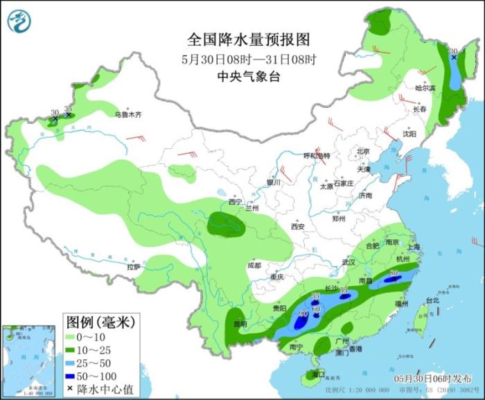 全國(guó)降水量預(yù)報(bào)圖(5月30日08時(shí)-31日08時(shí))