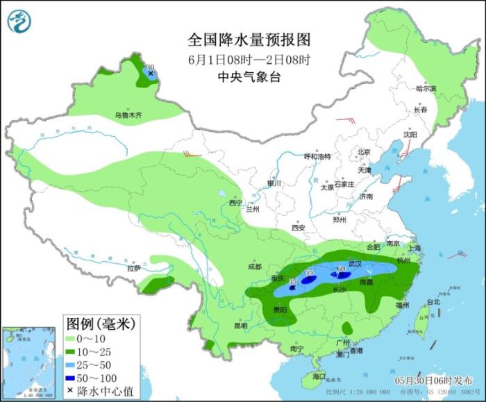 全國(guó)降水量預(yù)報(bào)圖(5月31日08時(shí)-6月1日08時(shí))