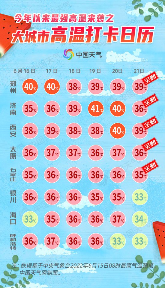 從中國天氣網推出的大城市高溫打卡日歷中可以看出,未來6天鄭州、濟南、西安、太原、石家莊都是高溫全勤到崗,酷熱持續(xù)不下線。銀川、呼和浩特等地高溫日數也將達到4天以上,晴熱暴曬全面來襲。
