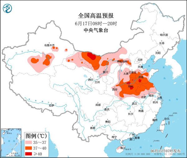 根據中央氣象臺預報,今天起至22日,北方多地將出現持續(xù)性高溫天氣,17至18日為最強時段。河北、河南、山東、湖北、江蘇、安徽、內蒙古、陜西、山西、寧夏、新疆、甘肅等12省區(qū)部分地區(qū)日最高氣溫可達35℃至38℃,局部可達40℃左右。