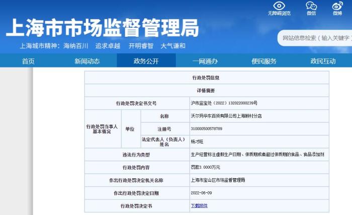 沃爾瑪上海一分店因售賣過期牛奶被罰3萬元