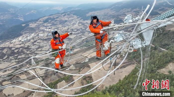 電力工人曾坤銀和熊志偉正在進行高空作業(yè)?!”R忠東 攝