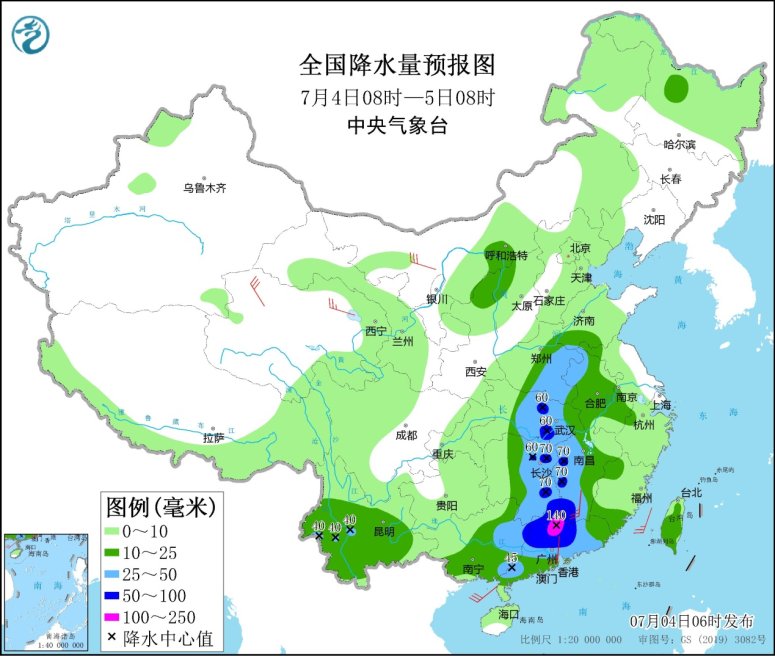 7月4日08時至5日08時,廣東大部、廣西東部、湖南中東部、江西西部和南部、湖北中部、河南東部等地部分地區(qū)有大到暴雨,其中,廣東北部等地部分地區(qū)有大暴雨(100~140毫米)。內(nèi)蒙古西部、甘肅西部、青海北部、東北地區(qū)南部、江南中部、華南東部等地的部分地區(qū)有4~6級風;東海北部海域有6~7級、陣風8級的旋轉(zhuǎn)風,東海南部海域、臺灣海峽、北部灣、南海北部和中部海域有5~6級、陣風7級的偏南到西南風。