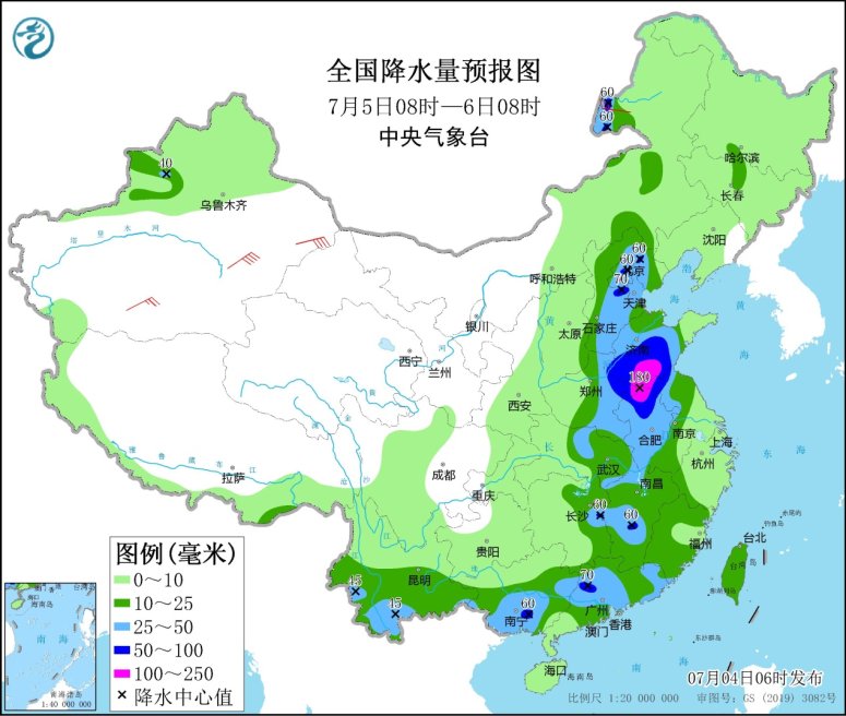 7月5日08時至6日08時,內(nèi)蒙古中東部、京津冀、黃淮中東部、西南地區(qū)南部、江淮大部、江漢東部、江南中東部、華南大部、臺灣島等地的部分地區(qū)有中到大雨,其中,山東中南部、河南東部、安徽北部、江蘇北部、京津冀、廣東北部等地的部分地區(qū)有暴雨,山東南部、安徽北部、江蘇北部、河南東部等地局地大暴雨(100~180毫米)。新疆北部和東部、內(nèi)蒙古西部、甘肅西部、東北地區(qū)南部、山東半島、江南東部等地的部分地區(qū)有4~6級風,其中,新疆東部、浙江東部等地的部分地區(qū)風力可達7級以上;東海大部海域、臺灣海峽、北部灣有5~6級、陣風7級的偏南到西南風。