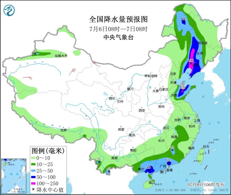 7月6日08時至7日08時,內(nèi)蒙古東部、黑龍西南部、吉林中西部、遼寧大部、河北東北部、山東、江南東部、華南大部、云南南部等地的部分地區(qū)有中到大雨,其中,遼寧大部、吉林西部、黑龍江西南部、山東中北部、廣西東南部、廣東中部和西南部等地的部分地區(qū)有暴雨或大暴雨(100~150毫米)。新疆東部和南疆盆地、內(nèi)蒙古中西部、甘肅西部、東北地區(qū)中南部、山東半島、江南東部等地的部分地區(qū)有4~6級風,其中,新疆東部、浙江東部等地的部分地區(qū)風力可達7級以上;渤海有5~7級、陣風8級的偏北風,渤海海峽、黃海北部海域有6~7級、陣風8級的東南風轉(zhuǎn)偏南風,黃海中部和南部海域、東海大部海域有5~6級、陣風7級的偏南到西南風。