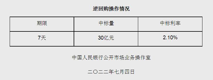 央行7月4日開展30億元逆回購操作 中標(biāo)利率2.10%