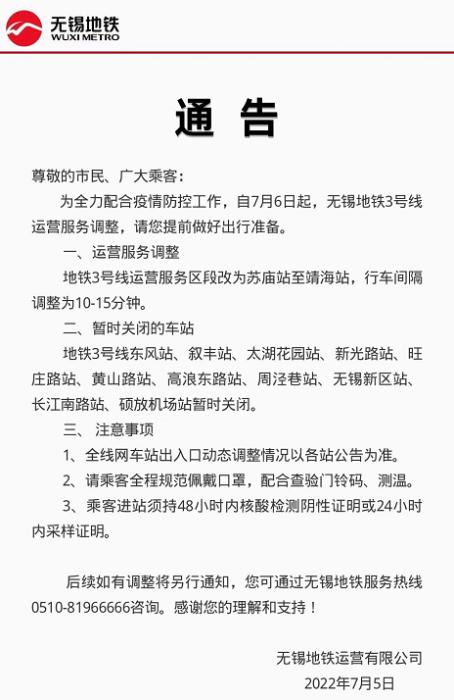 中新網7月6日電 據江蘇無錫地鐵官方微博消息,為全力配合疫情防控工作,自7月6日起,無錫地鐵3號線運營服務調整。