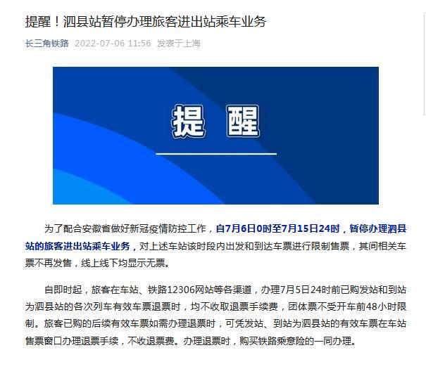 中新網(wǎng)7月6日電 據(jù)中國鐵路上海局集團有限公司官方微信消息,為了配合安徽省做好新冠疫情防控工作,自7月6日0時至7月15日24時,暫停辦理泗縣站的旅客進出站乘車業(yè)務,對上述車站該時段內(nèi)出發(fā)和到達車票進行限制售票,其間相關車票不再發(fā)售,線上線下均顯示無票。