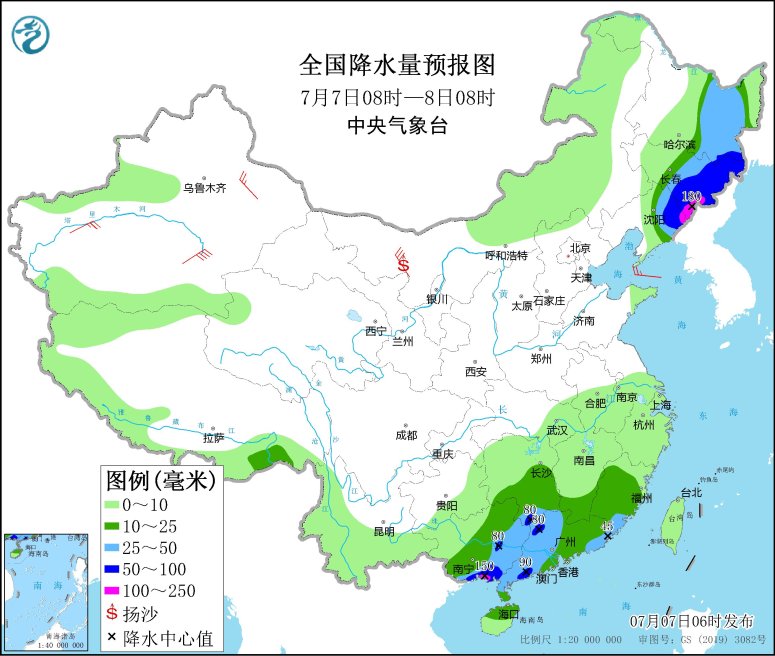 7月7日08時(shí)至8日08時(shí),遼寧東部、吉林中東部、黑龍江東部、廣西中東部、廣東西部和東南部等地有大到暴雨,其中,吉林東南部、廣西東南部等地的部分地區(qū)有大暴雨(100~180毫米)。內(nèi)蒙古西北部、新疆東部和南疆盆地等地部分地區(qū)有5~7級(jí)風(fēng)。黃海北部海域?qū)⒂?~8級(jí)、陣風(fēng)9級(jí)的偏南風(fēng)轉(zhuǎn)5~6級(jí)、陣風(fēng)7級(jí)的偏西風(fēng),渤海將有4~6級(jí)、陣風(fēng)7級(jí)的偏北風(fēng)轉(zhuǎn)西南風(fēng)。