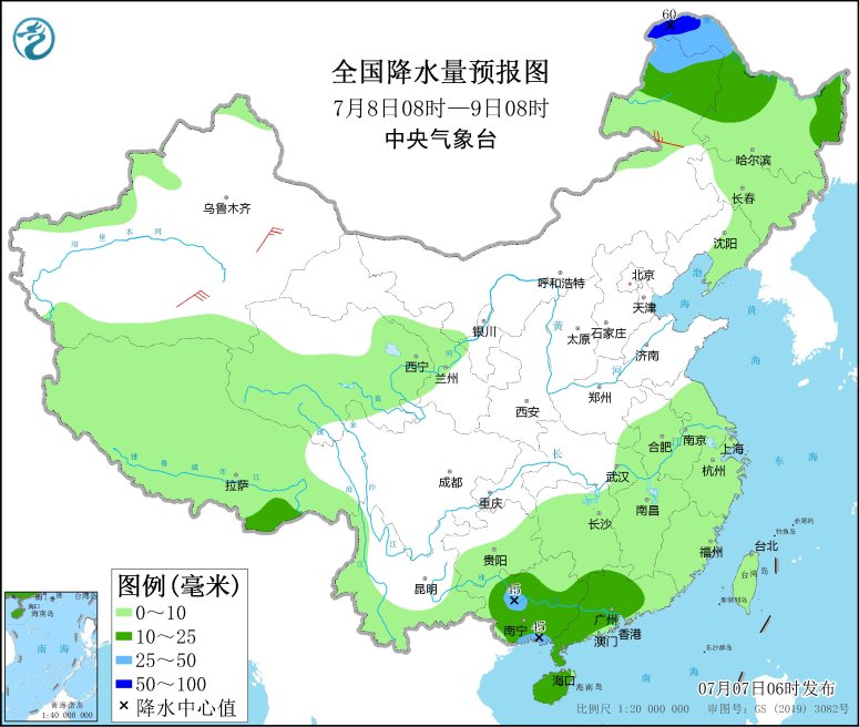 7月8日08時(shí)至9日08時(shí),內(nèi)蒙古東北部、黑龍江西部和東部、華南大部等地部分地區(qū)有中到大雨,其中,內(nèi)蒙古東北部、黑龍江西北部等地部分地區(qū)有暴雨(50~60毫米)。新疆沿天山地區(qū)和南疆盆地等地部分地區(qū)有4~6級(jí)風(fēng)。南海西南部海域?qū)⒂?~6級(jí)、陣風(fēng)7級(jí)的偏西風(fēng)。
