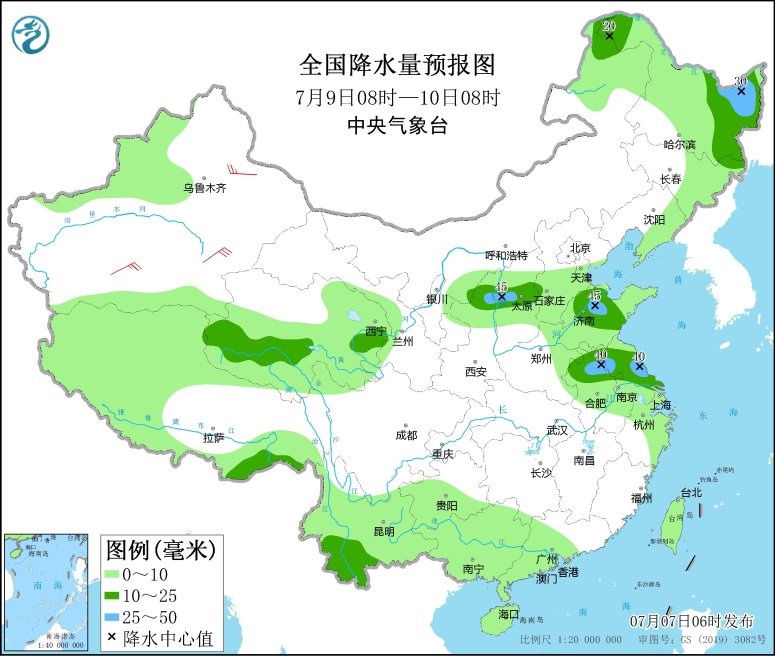 7月9日08時(shí)至10日08時(shí),內(nèi)蒙古東北部、東北地區(qū)東部、西北地區(qū)中部、華北中西部和南部、黃淮大部、江淮大部、華南大部、臺(tái)灣島等地有小到中雨,其中,黑龍江東北部、山西中部、山東中部、蘇皖北部等地部分地區(qū)有大雨(25~45毫米)。新疆沿天山地區(qū)和南疆盆地等地部分地區(qū)有4~6級(jí)風(fēng)。南海南部海域?qū)⒂?~6級(jí)、陣風(fēng)7級(jí)的偏西到西南風(fēng)。