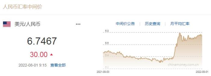 8月1日人民幣對美元中間價(jià)報(bào)6.7467元 下調(diào)30個(gè)基點(diǎn)