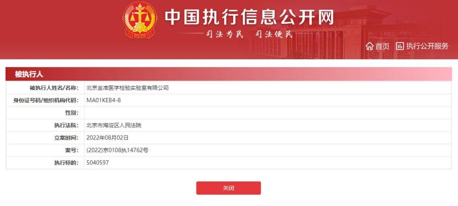 北京金準(zhǔn)醫(yī)學(xué)實驗室成被執(zhí)行人 執(zhí)行標(biāo)的504萬