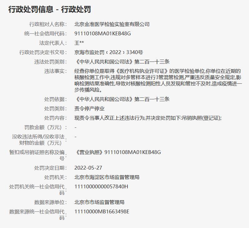 據(jù)信用中國(北京)網(wǎng)站5月31日行政處罰信息顯示,北京金準(zhǔn)醫(yī)學(xué)檢驗實驗室有限公司在近期的核酸檢測工作中,違規(guī)對多管樣本進(jìn)行3管混管檢測,嚴(yán)重違反質(zhì)量安全規(guī)定,影響檢測結(jié)果準(zhǔn)確性,導(dǎo)致對核酸檢測陽性人員發(fā)現(xiàn)和管控不及時,造成疫情進(jìn)一步傳播風(fēng)險。北京市海淀區(qū)市場監(jiān)督管理局決定吊銷其執(zhí)照(登記證)。(中新財經(jīng))