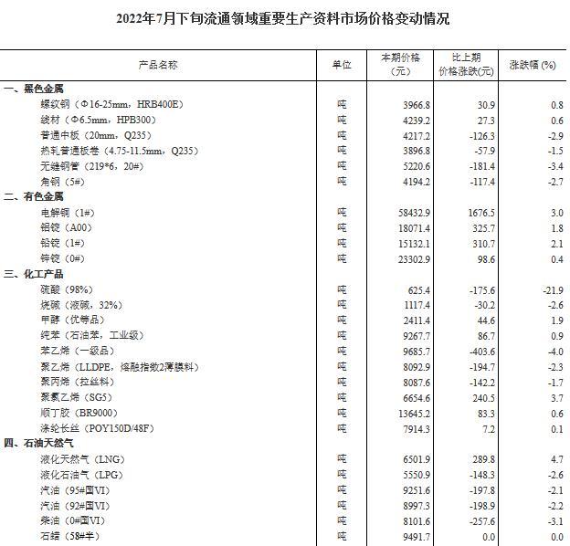中新網(wǎng)8月4日電 國家統(tǒng)計局4日公布2022年7月下旬流通領(lǐng)域重要生產(chǎn)資料市場價格變動情況,據(jù)對全國流通領(lǐng)域9大類50種重要生產(chǎn)資料市場價格的監(jiān)測顯示,2022年7月下旬與7月中旬相比,15種產(chǎn)品價格上漲,32種下降,3種持平。