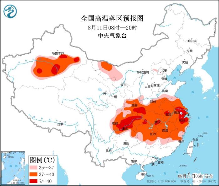 預(yù)計(jì)8月11日白天,新疆南疆盆地、內(nèi)蒙古西部、陜西中南部、河南中南部、安徽、江蘇、上海、四川中東部、重慶、湖北、湖南、江西、浙江、福建中北部、貴州北部等地有35~39℃高溫天氣,其中,陜西東南部、湖北西部和南部、四川東部、重慶、江蘇南部、安徽中部、浙江北部等地的部分地區(qū)可達(dá)40℃以上。中央氣象臺(tái)8月11日06時(shí)繼續(xù)發(fā)布高溫橙色預(yù)警。