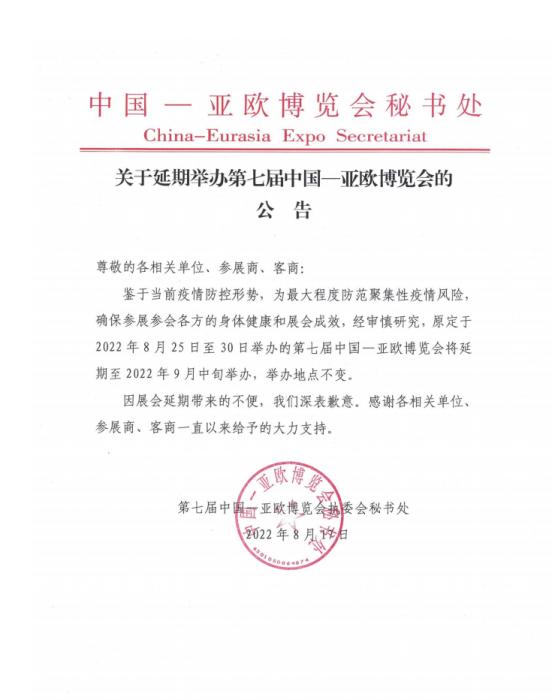 8月17日晚,第七屆中國(guó)—亞歐博覽會(huì)官網(wǎng)發(fā)布公告,宣布原定于8月25日在烏魯木齊舉辦的第七屆中國(guó)—亞歐博覽會(huì)將延期至9月中旬舉辦。通知內(nèi)容如下: