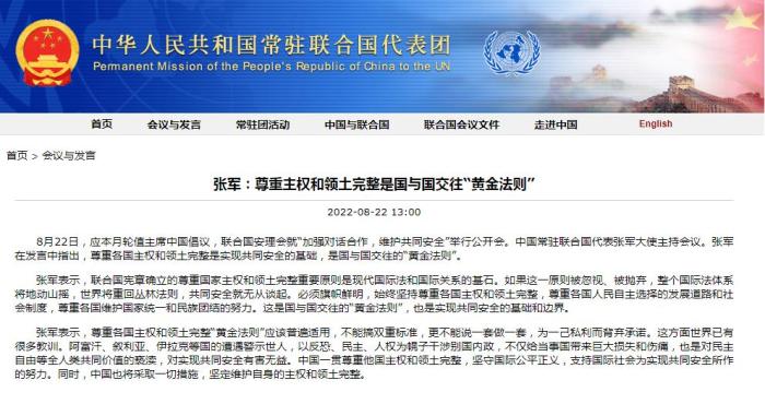 中新網(wǎng)8月23日電 據(jù)中國常駐聯(lián)合國代表團網(wǎng)站消息,中國常駐聯(lián)合國代表張軍大使在聯(lián)合國安理會的公開會上指出,尊重各國主權(quán)和領(lǐng)土完整是實現(xiàn)共同安全的基礎(chǔ),是國與國交往的“黃金法則”。
