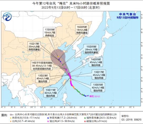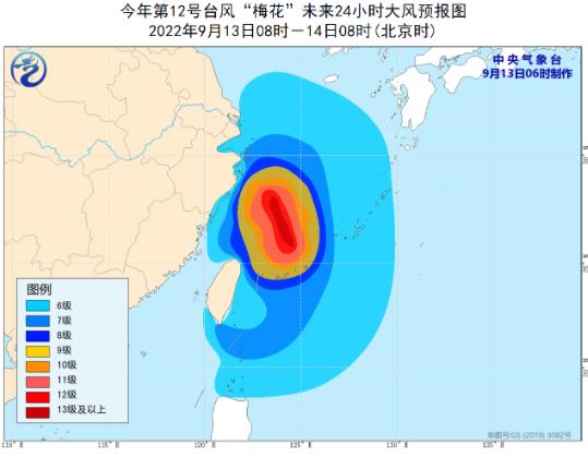 大風(fēng)預(yù)報:9月13日8時至14日8時,巴士海峽、臺灣海峽北部、臺灣以東洋面、黃海西南部海域、東海大部及釣魚島附近海域、長江口區(qū)、杭州灣以及臺灣島北部和東部沿海、浙江沿海、福建北部沿海、上海沿海、江蘇東南部沿海將有6-8級大風(fēng),陣風(fēng)9-11級,其中東海部分海域?qū)⒂?-11級大風(fēng),陣風(fēng)12-14級,“梅花”中心經(jīng)過的附近海面的風(fēng)力有12-14級,陣風(fēng)可達15-16級。