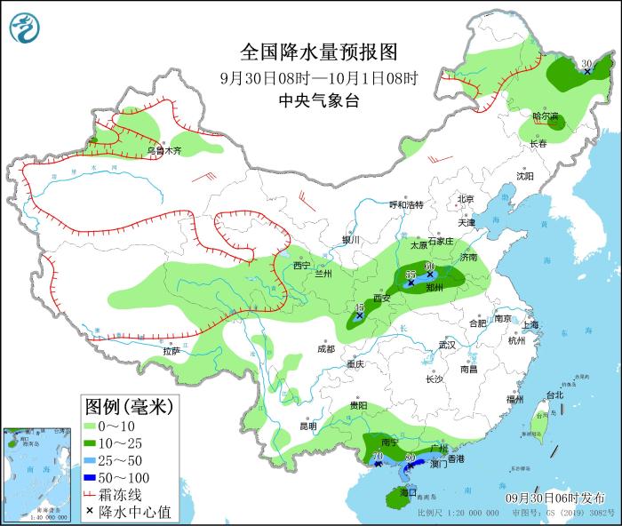 9月30日08時至10月1日08時,廣西南部、廣東西南部、海南島、四川東北部、陜西南部、山西南部、河南北部等地的部分地區(qū)有中到大雨,局地暴雨(50~70毫米);黑龍江、吉林北部、新疆沿天山地區(qū)、青藏高原中東部等地的部分地區(qū)有小到中雨。新疆東部、內蒙古中西部、東北地區(qū)東部等地的部分地區(qū)有4~6級風,新疆東部部分地區(qū)有7~8級風。