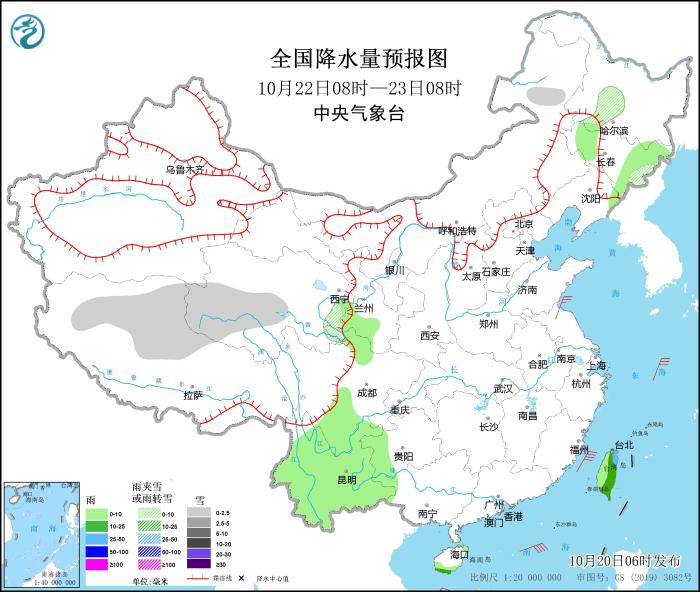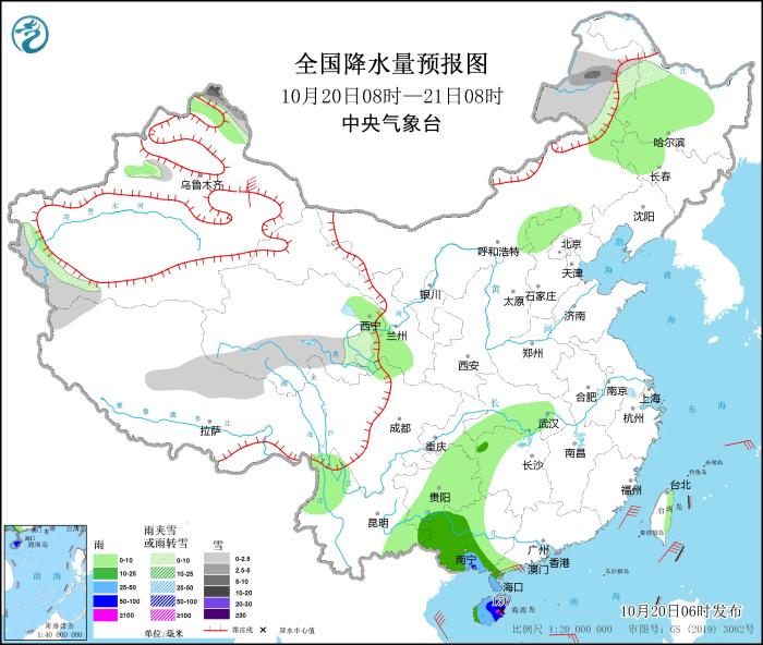 10月20日08時(shí)至21日08時(shí),內(nèi)蒙古東北部、新疆北疆北部和南疆西南部、西藏北部、青海東部和南部等地部分地區(qū)有小到中雪或雨夾雪,其中,新疆北疆北部等地部分地區(qū)有大到暴雪。廣西西部和南部、廣東西南部、海南島等地部分地區(qū)有中到大雨,其中,廣西南部沿海、海南島中東部等地部分地區(qū)有暴雨或大暴雨(100~150毫米)。