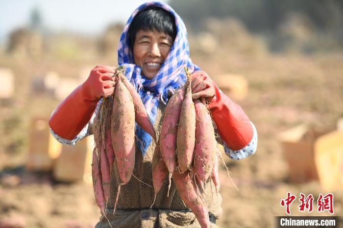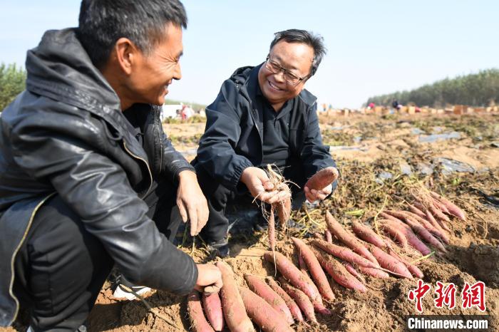 圖為河北薯農(nóng)展示今年豐收的紅薯?!∴嵆孔?攝