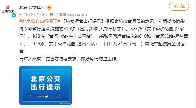 中新網(wǎng)10月23日電 北京公交集團(tuán)23日發(fā)布恢復(fù)運(yùn)營出行提示稱,根據(jù)廊坊市香河縣的意見,前期受疫情影響采取暫停運(yùn)營措施的810快(富力新城-大郊亭橋東)、823路(安平香汐花園-郎家園)、938快(香河總站-慶豐公園站),采取區(qū)間運(yùn)營措施的810路(香河總站-通州西站)、938路(安平香汐花園-通州西站),自10月24日(周一)首班車起恢復(fù)全線運(yùn)營。(中新財(cái)經(jīng))