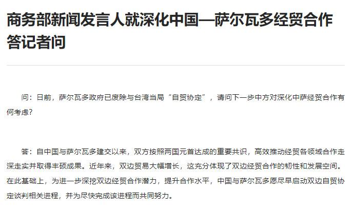 商務(wù)部新聞發(fā)言人就深化中國—薩爾瓦多經(jīng)貿(mào)合作答記者問
