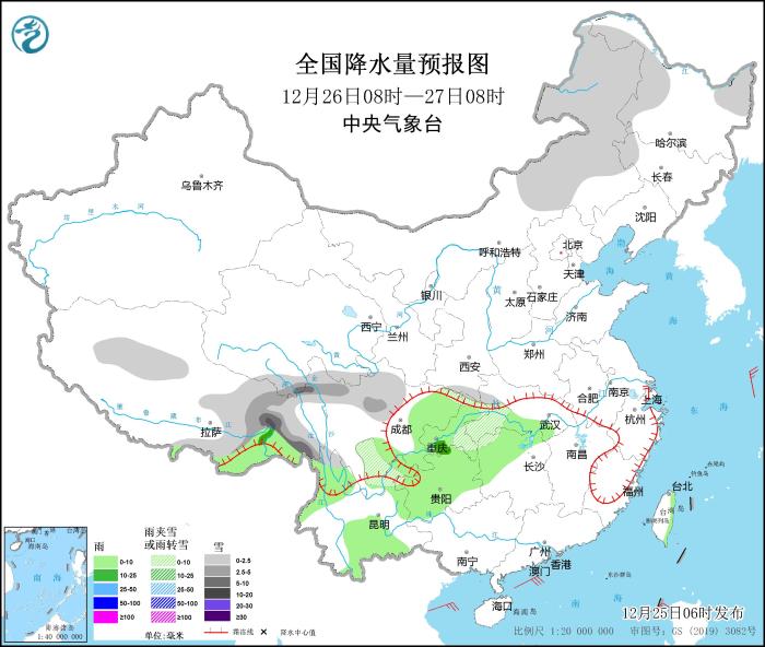 12月26日08時至27日08時,內(nèi)蒙古東部、黑龍江西部和東北部、西藏北部和東部、川西高原北部、湖北西部等地部分地區(qū)有小到中雪或雨夾雪,其中,西藏東南部等地部分地區(qū)有大到暴雪。西藏東南部、湖南北部和西部、西南地區(qū)東部、云南西部和東南部等地部分地區(qū)有小雨,其中,西藏東南部、重慶西部、貴州東北部等地部分地區(qū)有中雨。臺灣海峽、巴士海峽、南海大部海域、北部灣將有6~7級、陣風8級的東北風。