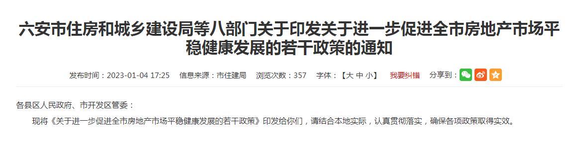 中新網1月5日電 據安徽省六安市住房和城鄉(xiāng)建設局網站消息,近日,六安市住房和城鄉(xiāng)建設局等八部門印發(fā)《關于進一步促進全市房地產市場平穩(wěn)健康發(fā)展的若干政策》。