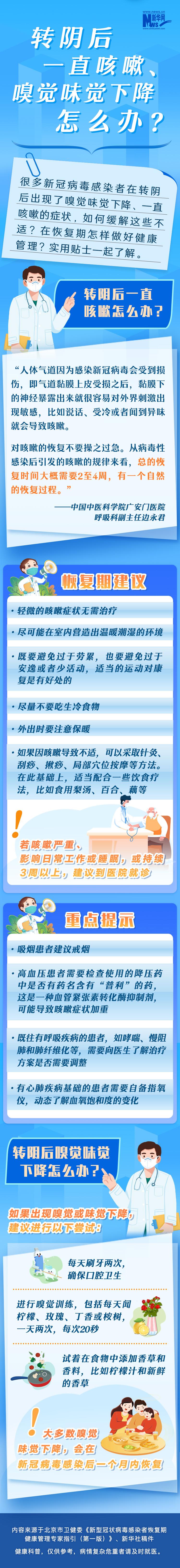 很多新冠病毒感染者在轉(zhuǎn)陰后出現(xiàn)了嗅覺味覺下降、一直咳嗽的癥狀,如何緩解這些不適?在恢復(fù)期怎樣做好健康管理?實用貼士一起了解。