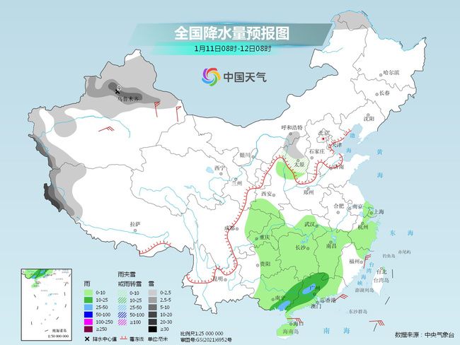 明天,隨著補充弱冷空氣南下,暖濕氣流增強,我國中東部雨雪天氣將增多,其中黑龍江西北部、新疆北部和西部山區(qū)、西藏西部、陜西北部、山西中北部等地部分地區(qū)有小到中雪或雨夾雪,其中,新疆沿天山地區(qū)、西藏西部等地局地有大到暴雪。江漢南部、江南大部、西南地區(qū)東部、華南等地部分地區(qū)有小到中雨,局地有大雨。