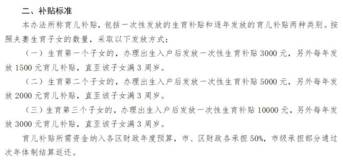 辦法擬規(guī)定,按照夫妻生育子女的數(shù)量,發(fā)放育兒補(bǔ)貼。其中,生育第一個(gè)子女的,辦理出生入戶(hù)后發(fā)放一次性生育補(bǔ)貼3000元,另外每年發(fā)放1500元育兒補(bǔ)貼,直至該子女滿(mǎn)3周歲;生育第二個(gè)子女的,辦理出生入戶(hù)后發(fā)放一次性生育補(bǔ)貼5000元,另外每年發(fā)放2000元育兒補(bǔ)貼,直至該子女滿(mǎn)3周歲;生育第三個(gè)子女的,辦理出生入戶(hù)后發(fā)放一次性生育補(bǔ)貼10000元,另外每年發(fā)放3000元育兒補(bǔ)貼,直至該子女滿(mǎn)3周歲。育兒補(bǔ)貼所需資金納入各區(qū)財(cái)政年度預(yù)算,市、區(qū)財(cái)政各承擔(dān)50%,市級(jí)承擔(dān)部分通過(guò)次年體制結(jié)算返還。(中新財(cái)經(jīng))