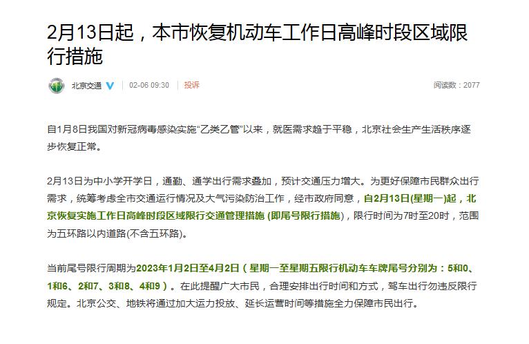 2月13日起,北京恢復機動車工作日高峰時段區(qū)域限行措施