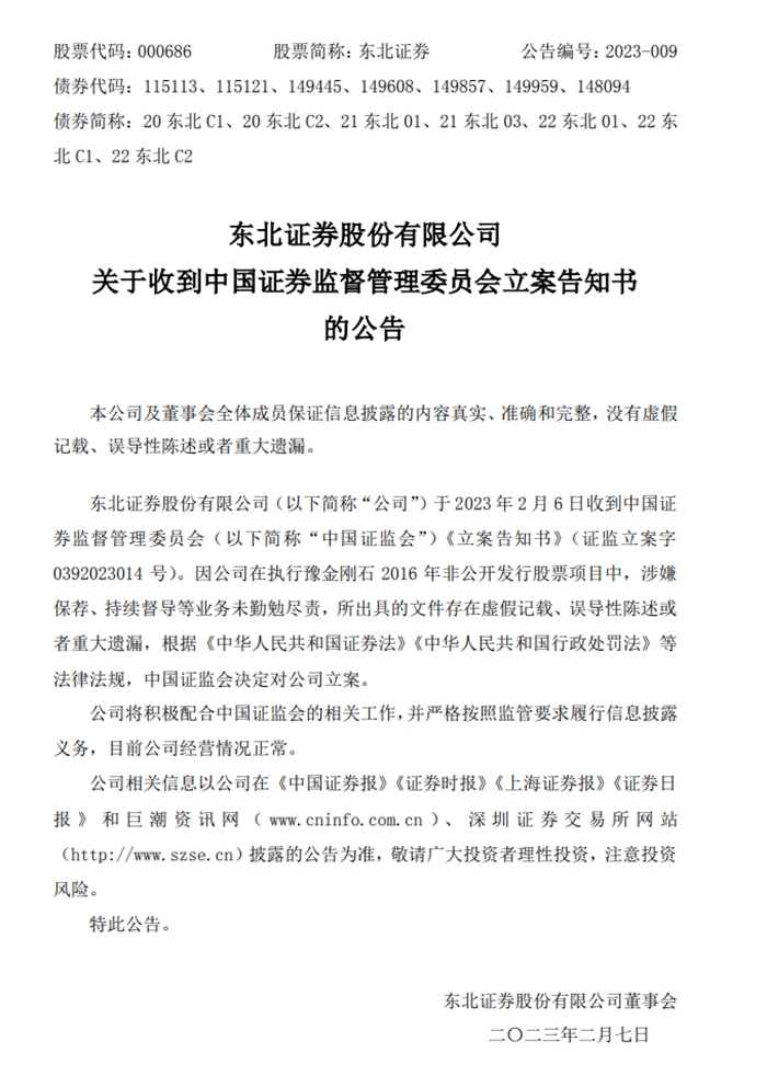 中新網(wǎng)2月7日電 7日,東北證券發(fā)公告稱(chēng),東北證券股份有限公司于2023年2月6日收到中國(guó)證券監(jiān)督管理委員會(huì)《立案告知書(shū)》(證監(jiān)立案字 0392023014 號(hào))。因公司在執(zhí)行豫金剛石2016年非公開(kāi)發(fā)行股票項(xiàng)目中,涉嫌保薦、持續(xù)督導(dǎo)等業(yè)務(wù)未勤勉盡責(zé),所出具的文件存在虛假記載、誤導(dǎo)性陳述或者重大遺漏,根據(jù)相關(guān)法律法規(guī),中國(guó)證監(jiān)會(huì)決定對(duì)公司立案。(中新財(cái)經(jīng))