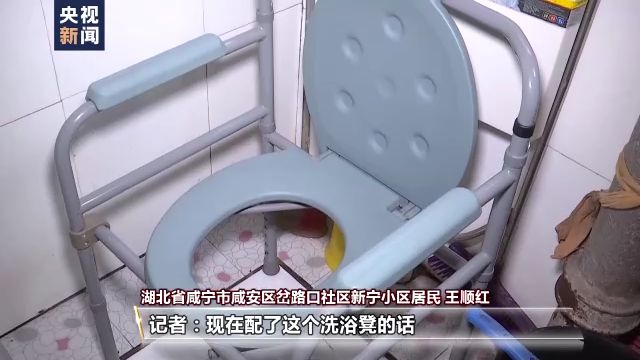 湖北省咸寧市咸安區(qū)岔路口社區(qū)新寧小區(qū)居民 王順紅:原來(lái)就用盆,給他擦洗。現(xiàn)在方便多了,洗浴凳又穩(wěn),不怕摔跤,帶來(lái)很大的方便。