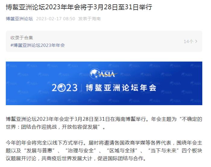 博鰲亞洲論壇2023年年會將于3月28日至31日舉行